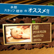 フレームと文字の色を2色からお選びいただき、お子様のお名前、誕生日と時間、出生体重を彫りこむことができます。もちろん、熟練した職人による手作り。ひとつひとつ心を込めて手作りさせていただきます。かけがえのないお子様のために、世界にたったひとつの贈り物を・・・出産祝いにも喜ばれる事間違いなしです!
