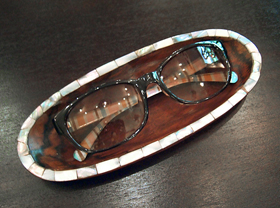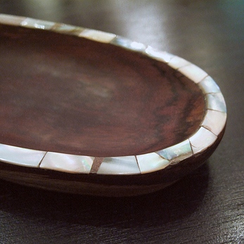 温かみのあるマンゴー製のトレイの淵には、シェルのアクセント |