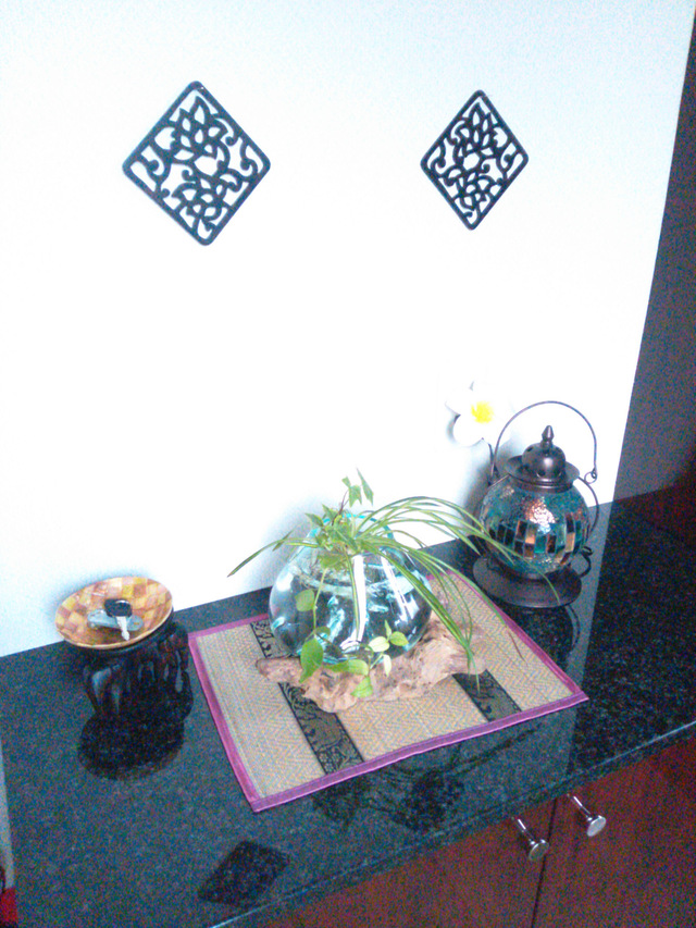 玄関の棚にチーク&ガラスアクアリウムを置きました! 家にある植物を使って生けてみたものの、まだまだ納得のいく仕上がりではないので少しずつ変えていきたいです。 壁が寂しかったのでカービングコースターを並べて飾ってアジアンぽい雰囲気を出してみました☆
