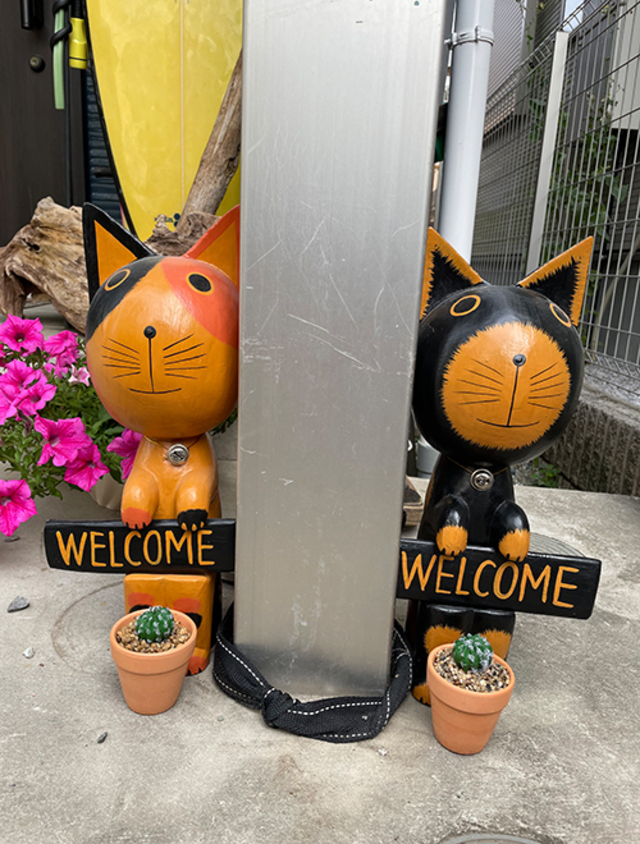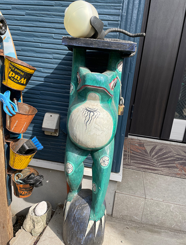 外回りのカエル、猫の置物を置き、明るい雰囲気にしてます。