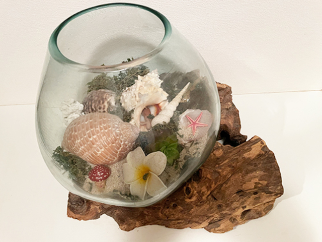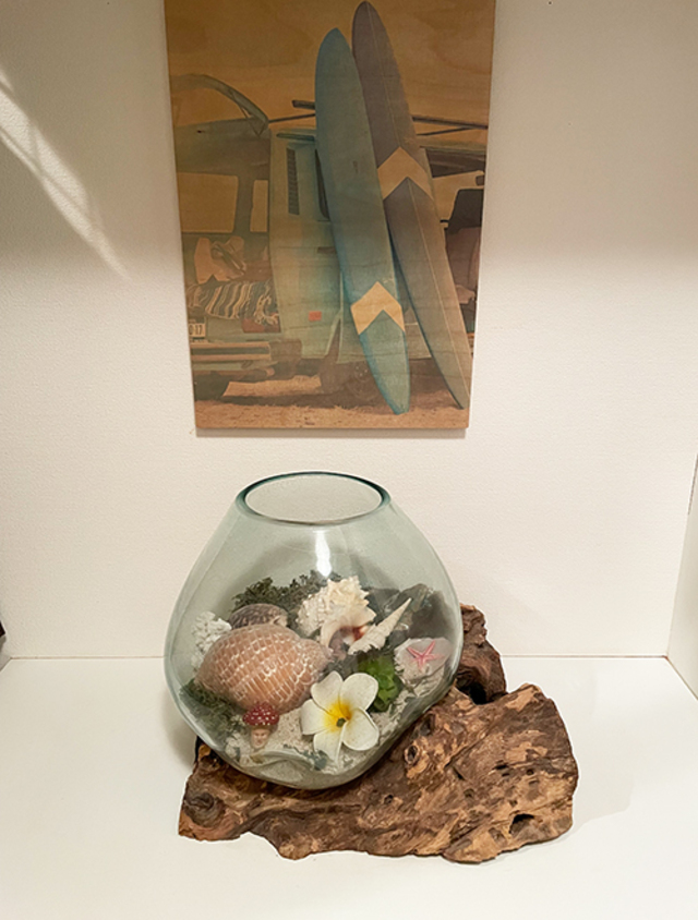 下駄箱上の空間に流木ガラスを置き、我が家の玄関周りは、アジアンでなく、こちらの流木オンガラスを置き(ガラスの中に砂浜、貝等いれました。)海をイメージさせていただき配置しました。 ガラスに入ってます砂は鹿児島県種子島の海岸の綺麗な砂があったので入れさせていただきました。